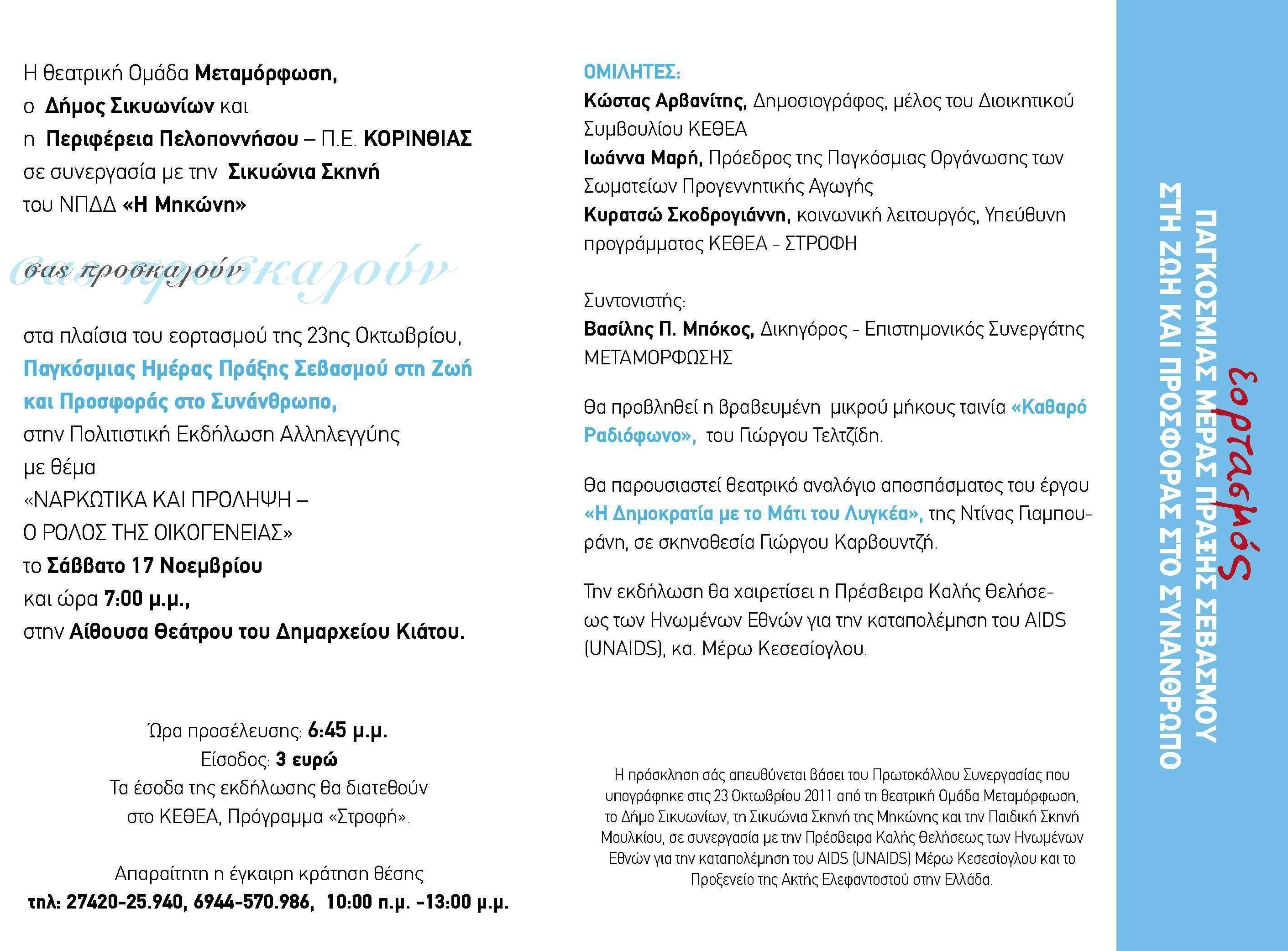 Για τον ίδιο σκοπό, θα παρουσιαστεί την Παρασκευή, 9 Νοεμβρίου 2012, στις 12.00 μ.μ., στην αίθουσα θεάτρου του Δημαρχείου Κιάτου, η κωμωδία του Αριστοφάνη «Όρνιθες», από το παιδικό τμήμα της «Σικυώνιας Σκηνής», σε σκηνοθεσία Γιώργου Καρβουντζή, για τα σχολεία της περιοχής.